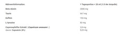 Nimm 30 ml (½ der Ampulle) etwa 30 Minuten vor dem Training ein. Zur genauen Dosierung (30 ml) verwende den beiliegenden Dosierbecher (2 x 15 ml). Vor dem Verzehr gut schütteln. 1 Ampulle enthält 2 Portionen. Nach dem Öffnen kühl lagern und innerhalb von 48 Stunden verzehren.