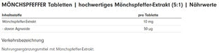 Unsere MÖNCHSPFEFFER Extrakt-Tabletten beinhalten ein hochwertiges Mönchspfeffer-Extrakt mit einem Extraktionsverhältnis von 5:1. Pro Tablette sind 10 mg Mönchspfeffer-Extrakt enthalten, was somit 50 mg gewöhnlichem Mönchspfeffer-Pulver entspricht. Wir verwenden einen Mönchspfeffer-Rohstoff mit einem ausgewiesenen Gehalt an Agnusiden. Hierbei handelt es sich um einen sekundären Pflanzenstoff, welcher mit zahlreichen positiven Wirkungen im Körper in Verbindung gebracht wird.