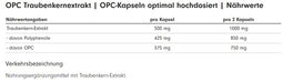 Eine Kapsel (Tagesportion) enthält 500 mg hochwertiges Traubenkernextrakt und liefert dem Körper 425 mg Polyphenole, davon 375 mg reines OPC. Wir verwenden für unsere OPC-Kapseln ein besonders hochwertiges Traubenkernextrakt aus deutschen weißen Trauben mit einem außerordentlich hohen OPC-Gehalt von echten 75% - nachgewiesen mit der genauen HPLC-Methode. Die OPC-Kapseln enthalten keinerlei Zusatzstoffe und sind dank der rein pflanzlichen Kapselhülle auch 100% vegan.