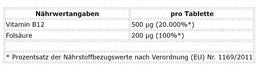 Vitamin B12 und Folsäure sind in unserem Stoffwechsel eng miteinander verknüpft, sodass ein Vitamin B12-Mangel indirekt zu einem Folsäure-Mangel führt. Das VITAMIN B12 + FOLSÄURE enthält daher neben dem Methylcobalamin, der hochwertigsten Vitamin B12-Form auch eine perfekt abgestimmte Dosierung bioaktiver Folsäure (Vitamin B9). Eine Tablette VITAMIN B12 + FOLSÄURE täglich deckt den gesamten Tagesbedarf an Vitamin B12 und Folsäure optimal ab und leistet damit einen wertvollen Beitrag zu einem gesunden und leistungsfähigen Körper.